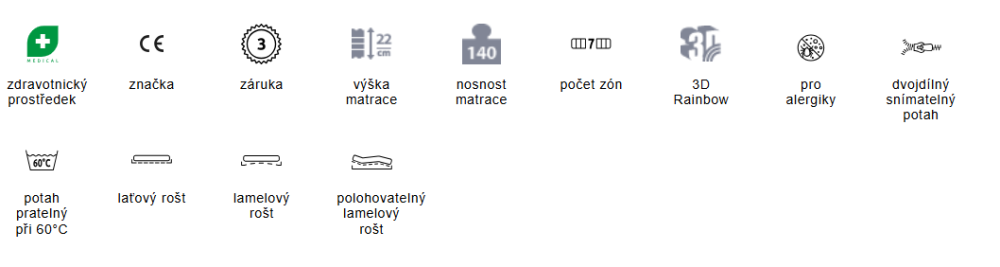 - Druhá strana „relax“ má masážní profilaci 3D Rainbow (použití více pěn rozdílných vlastností a tuhosti na jedné lehací ploše) a je o tužší strana HARD. Součástí je pratelný dvojdílný antialergický potah Bamboo s vlastností odpuzující vlhkost.