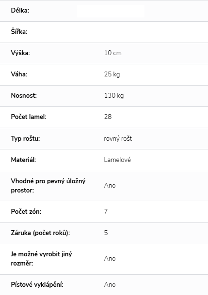 Uvedený rozměr roštu odpovídá požadovanému rozměru matrace. Rošty jsou standardně o 1 cm užší (šířka) a o 5 cm kratší (délka) proti požadovanému rozměru matrace pro jednoduché vložení do rámu postele.