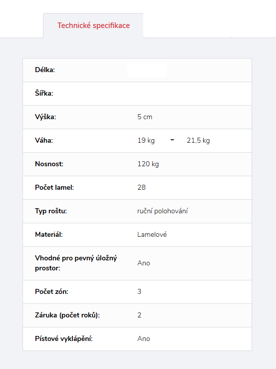 Uvedený rozměr roštu odpovídá požadovanému rozměru matrace. Rošty jsou standardně o 1 cm užší (šířka) a o 5 cm kratší (délka) proti požadovanému rozměru matrace pro jednoduché vložení do rámu postele.